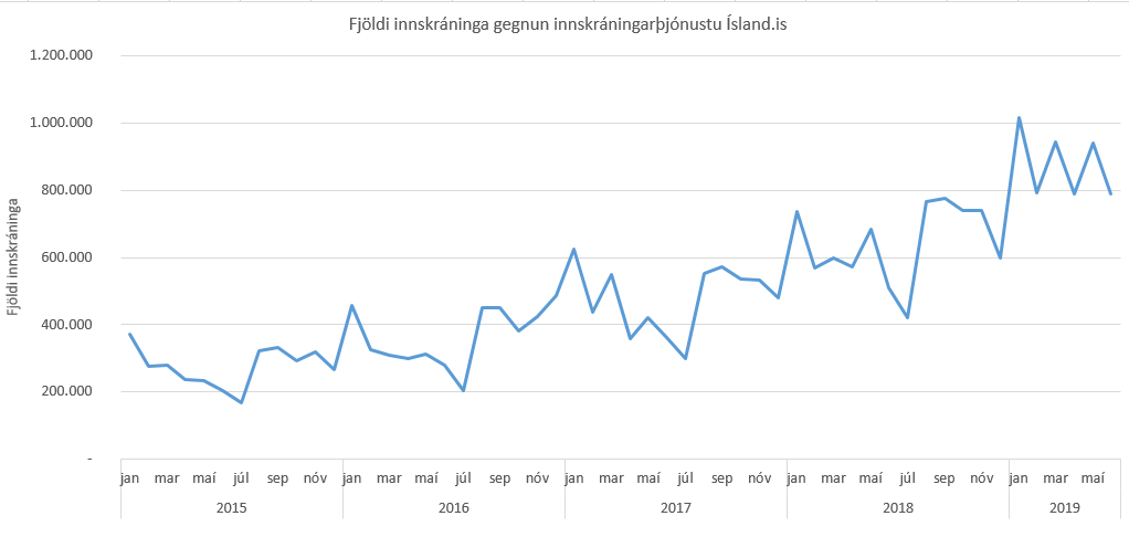 Innskráningarþjónusta Ísland.is býður upp á innskráningu inn á vefi yfir 200 þjónustuveitenda og að jafnaði 25 þúsund manns nýta sér þjónustuna daglega. Í júní 2019 voru samtals 788.530 innskráningar. Í júní 2018 voru innskráningar samtals 510.496 og fjölgar því innskráningum um 54% frá sama tíma í fyrra. Samtals hafa 9.308.060 innskráningar verið skráðar síðastliðna 12 mánuði.
