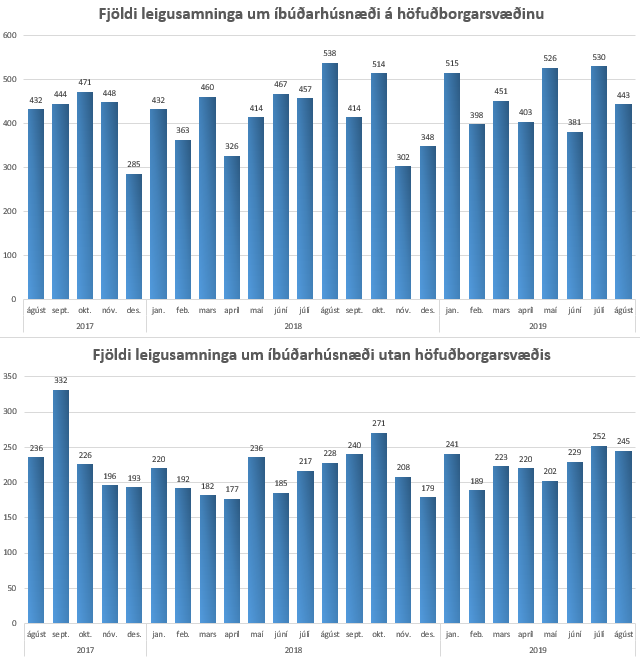 Þjóðskrá Íslands hefur tekið saman upplýsingar um fjölda þinglýstra leigusamninga um íbúðarhúsnæði eftir landshlutum í ágúst 2019.
