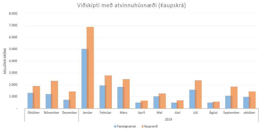 Í október 2019 var 52 skjölum (kaupsamningum og afsölum) um atvinnuhúsnæði á höfuðborgarsvæðinu þinglýst. Heildarfasteignamat seldra eigna var 8.772 milljónir króna. Af þessum skjölum voru 16 um verslunar- og skrifstofuhúsnæði.