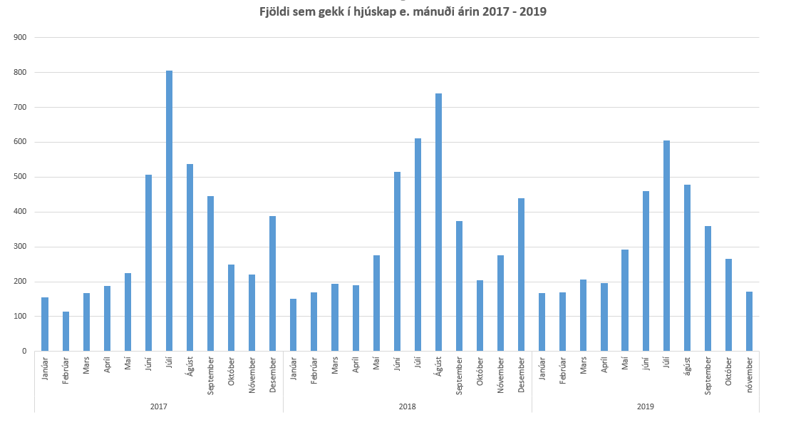 Af þeim 171 einstaklingum sem stofnuðu til hjúskapar í síðasta mánuði gengu 96 í hjúskap hjá sýslumanni eða 56,1%, 57 giftu sig í Þjóðkirkjunni eða 33,3%, og 18 einstaklingar gengu í hjúskap í öðru trúfélagi eða 10,5%.