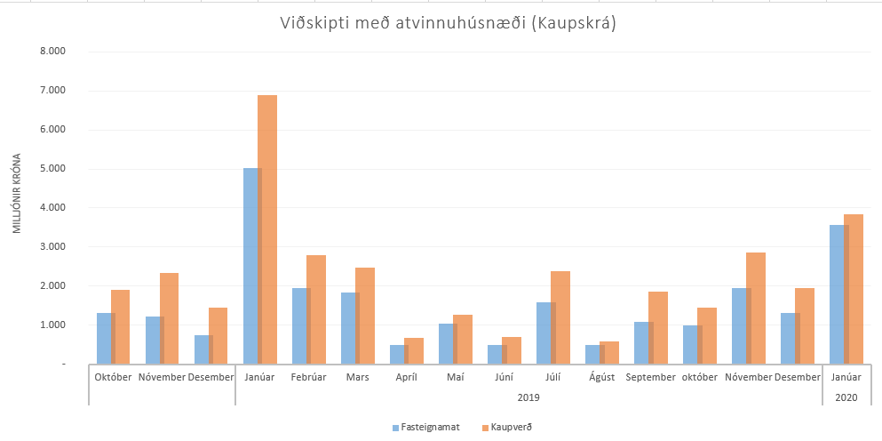 Í janúar 2020 var 66 skjölum (kaupsamningum og afsölum) um atvinnuhúsnæði á höfuðborgarsvæðinu þinglýst. Heildarfasteignamat seldra eigna var 5.747 milljónir króna. Af þessum skjölum voru 14 um verslunar- og skrifstofuhúsnæði.