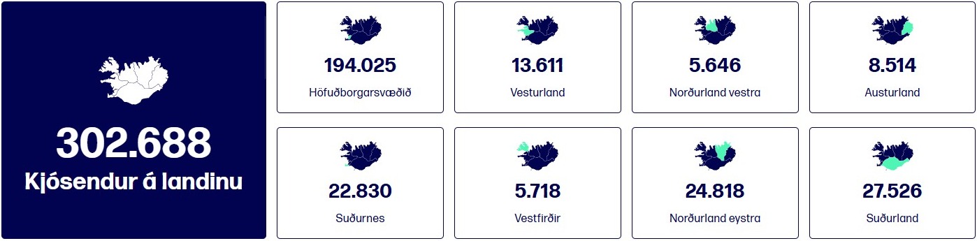 Flesta kjósendur er að finna á Höfuðborgarsvæðinu, eða 194.025, en næstflesta á Suðurlandi, þar sem þeir eru 27.526.